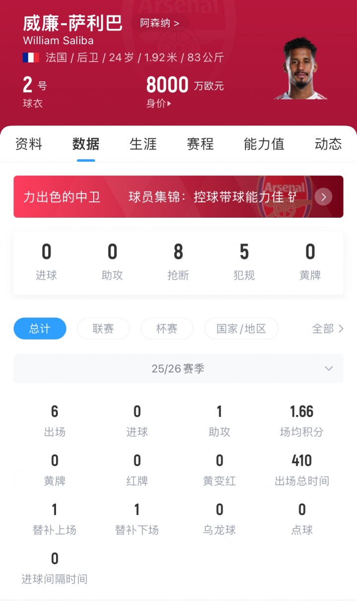 萨利巴现年24岁,法国中卫,阿森纳在2019年花费3000万欧元将其从圣埃蒂安签下。目前萨利巴总计代表枪手出战139次,贡献7球3助,随队收获两个社区盾冠军。目前球员德转身价为8000万欧元。