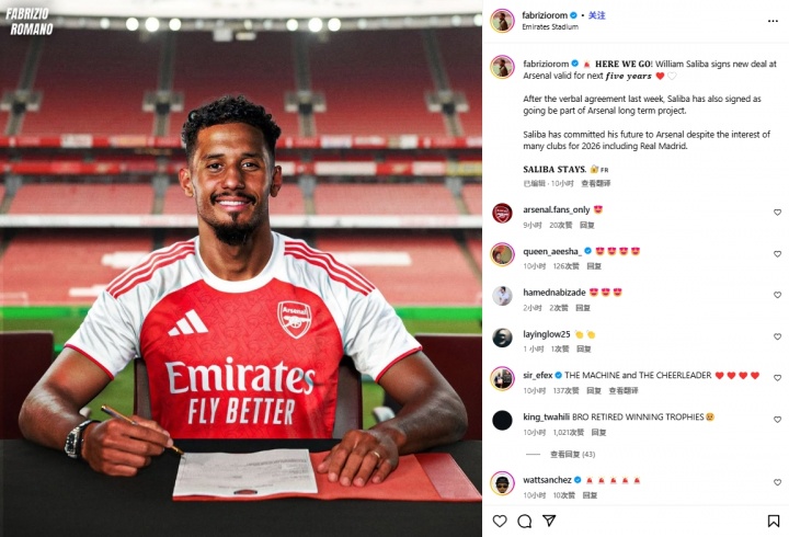 罗马诺表示:萨利巴上周达成口头协议后,已正式签约成为阿森纳长期计划的一部分。尽管包括皇家马德里在内的多家俱乐部对其感兴趣,萨利巴仍决定未来留在阿森纳。