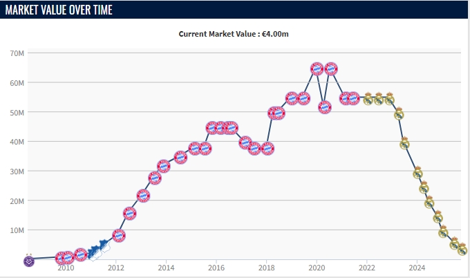2021年夏窗阿拉巴与拜仁合同到期,随后自由身加盟皇马,29岁的他在皇马也夺得了不少冠军。30岁时阿拉巴身价尚有5500万欧,但受伤病影响,仅仅3年便降到只剩400万欧,跌回了最初闪耀霍村之时的身价。